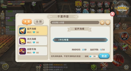 除了跨服招募之外,传音功能上线!使用海螺即可让本服或者其他服务器的玩家听到自己的声音了,就算不打开聊天栏也能看到。不同的海螺还会让信息各种颜色和特效。